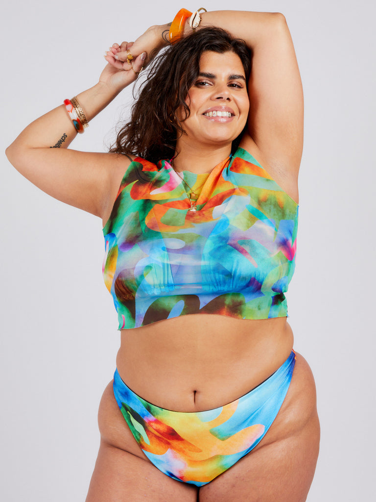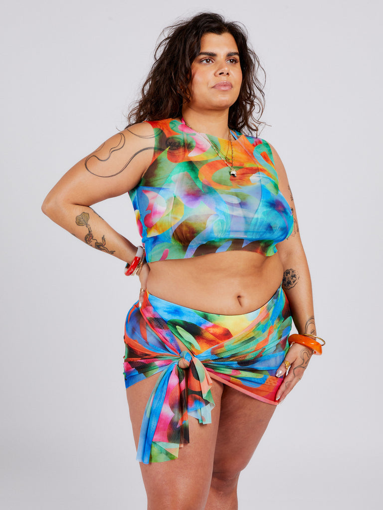 The KIRA Sleeveless Mesh Crop Top is the perfect lightweight piece for your wardrobe. The paradise tie dye print on the breathable mesh fabric adds a pop of colour and comfort so you can make a statement at the beach or at the bar.